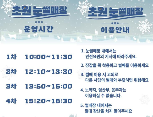 탁 트인 초원에서 눈썰매를 탈 수 있는 초원 눈썰매장은 입장 시 무료 이용가능하며 썰매 역시 무상 대여 한다. 눈썰매장 주변에는 히터가 설치된 고객쉼터, 식당가 등 편의시설이 갖춰져 있어 눈썰매 이용 후 언 몸을 녹이며 따뜻하게 쉴 수 있다. 눈썰매 이외에도 빙어잡기, 가축먹이주기, 체험승마 등 다양한 체험을 할 수 있고 어린이를 위한 놀이기구도 준비되어 있다.