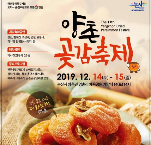 천혜의 자연조건으로 높은 품질을 자랑하는 양촌곶감, 구슬땀을 흘리며 덕장에 곶감들로 아름다운 전경을 수놓은 곶감농가들, 그 결실을 맺어가는 계절 12월 우리를 찾아온다. 2006년 곶감특구 지정, 충청남도지사의 품질인증 Q마크 획득, 한국일보 주최 2008 대한민국 우수특산품 대상 선정등으로 청정지역의 지역특산품의 양촌곶감의 우수성은 이미 널리 인정된 바있다. 또한 양촌의 아름다운 강과 산으로 어우러진 양임교 논산천둔치에서 개최되는 '양촌곶감축제'는 다양한 볼거리, 먹을거리, 즐길거리 등으로 눈과 귀와 입을 즐겁게 하는 축제로 다양한 프로그램을 선보인다.