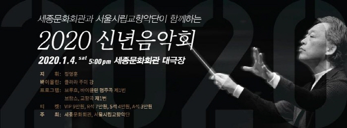 '세종문화회관과 서울시립교향악단이 함께하는 2020 신년음악회. 서울시향의 예술감독(2005~2015)을 지낸 세계적인 지휘자 정명훈은 대표 레퍼토리인 브람스 교향곡 1번으로 서울시향과 5년 만에 재회한다. 클라라 주미 강은 독일 후기 낭만주의 작곡가인 브루흐가 작곡한 기교 넘치는 첫 번째 바이올린 협주곡을 연주한다.
