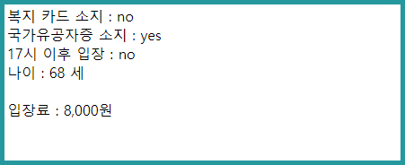 - 복지 카드 소지자는 $welfare를 yes로, 미소지자는 no로 설정한다.국가유공자증 소지자는 $youkong을 yes로, 미소지자는 no로 설정한다. 17시 이후 입장객은 $after를 yes로, 17시 이전 입장객은 no로 설정한다.